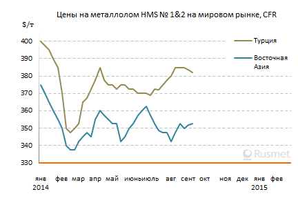 По сходному сценарию развиваются события и в странах Восточной Азии. Американские компании удерживают экспортные котировки на металлолом на относительно высоком уровне, предлагая материал HMS № 1 (80&20) с контейнерной доставкой на Тайвань более чем по $350 за т CFR, а крупнотоннажные партии HMS № 1 в Корею ‒ примерно по $380 за т CFR. Но спрос со стороны корейских покупателей пока весьма низкий, а металлурги рассчитывают на понижение, тем более, что стоимость железной руды в регионе в сентябре упала до самого низкого уровня с 2009 года.