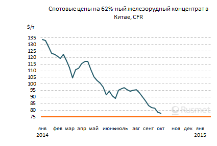 /Rusmet.ru, Виктор Тарнавский/ Спотовые цены на железную руду непрерывно падают на протяжении вот уже двух месяцев. Перед недельной паузой, вызванной празднованием очередной годовщины основания КНР, стоимость 62%-ного австралийского сырья опустилась до $77,5 за т CFR Китай. Это самый низкий уровень с сентября 2009 года. С начала текущего года руда подешевела уже более чем на 42%.