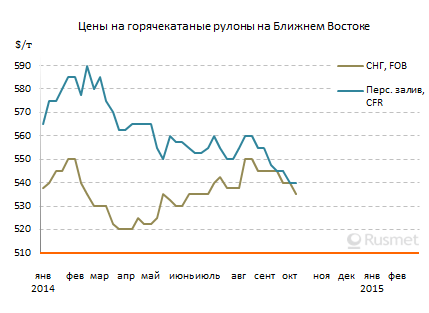Спрос на продукцию не китайского производства в настоящее время имеет в странах Персидского залива ограниченный характер. Объясняется это, прежде всего, тем, что поставщики из Индии и государств Северо-Восточной Азии пока лишь в минимальной степени удешевили свою продукцию. Так, в первых числах октября горячекатаные рулоны S235JR индийского, японского и корейского производства котировались в странах региона на уровне $550-560 за т CFR, что уступало показателям месячной давности не более чем $10 за т. В целом восточноазиатские компании в последнее время больше специализируются на поставках в Персидский залив тонкого горячего проката повышенного качества.