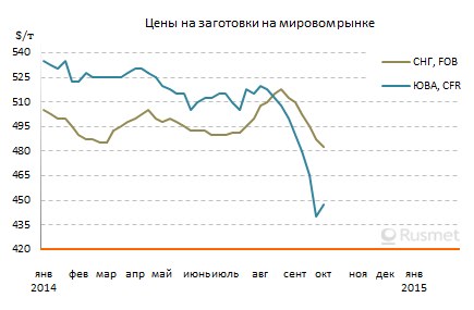 В первую неделю октября, пока китайцы отсутствовали на рынке, новых сделок в регионе практически не заключалось. Российские и украинские экспортеры столкнулись с серьезными сбытовыми проблемами. Большинство основных производителей заготовок до сих пор не распродали октябрьскую продукцию. При этом, котировки на нее в сентябре, как правило, не опускались ниже $490 за т FOB, но сейчас и предложения на уровне $480-485 за т FOB не вызывают особого интереса.