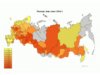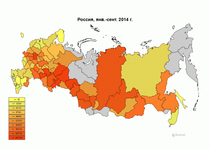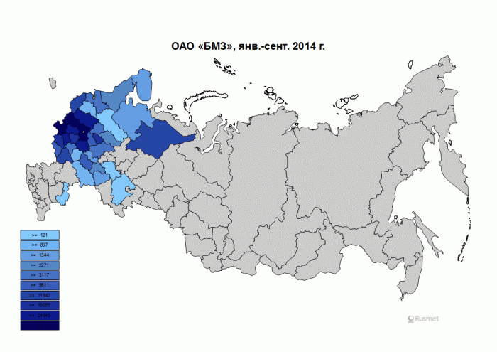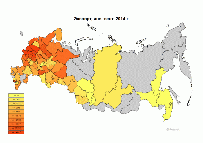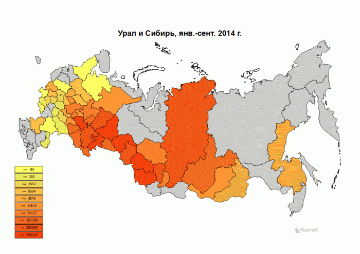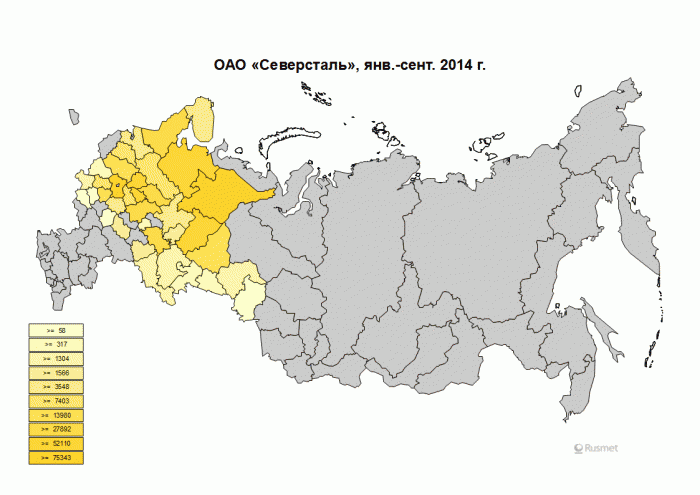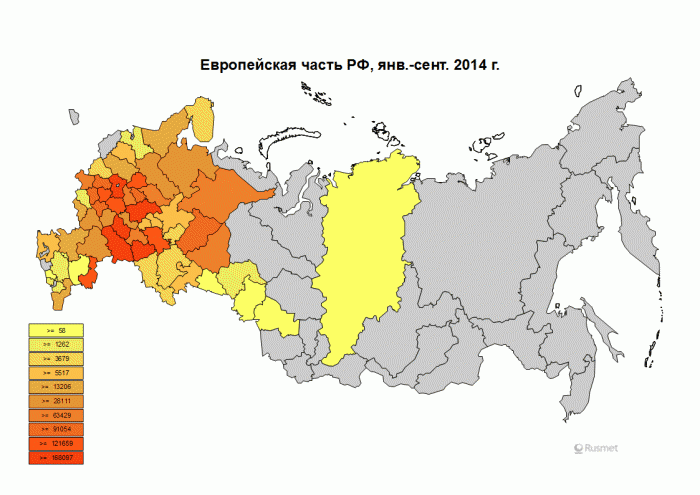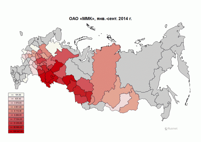 Географическая структура отгрузки металлолома с территории России за первые девять месяцев 2014 г. представлена на Рис. 2. Всего за указанный период железнодорожным транспортом в адрес потребителей было перевезено порядка 14,6 млн. т лома черных металлов. Цветовая кодировка областей указывает на тоннаж отгружаемого из области металлолома: чем в более темный цвет окрашена область, тем больше лома из нее было отгружено.