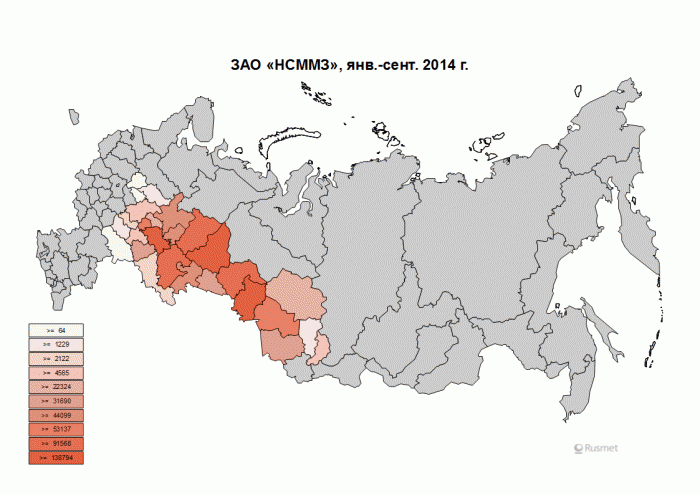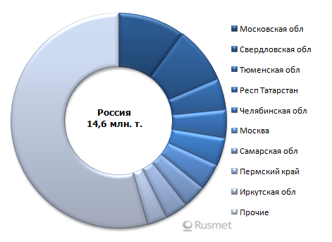 ОАО «НЛМК» за первые восемь месяцев 2014 г. увеличила выплавку стали на 1,63% относительно АППГ до 8,35 млн. т. При этом по итогам первых девяти месяцев 2014 г. поступление металлолома по железной дороге возросло на 16,5% до 0,98 млн. т. Максимальные отгрузки производились из Московской (345 тыс. т), Самарской (130 тыс. т) и Пензенской (75 тыс. т) областей (Рис. 5).