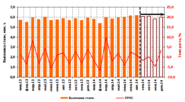 /Rusmet.ru, Алексей Чижиков/ За первые восемь месяцев 2014 г. отечественными предприятиями было выплавлено 47,3 млн. т жидкой стали, что почти на 2% больше показателей аналогичного периода прошлого года. Выплавка стали ключевыми металлургическими предприятиями европейской части России (ОАО «Северсталь», ОАО «НЛМК», ОАО «НЛМК-Калуга», ОАО «ОЭМК», ОАО «РЭМЗ», ОАО «ВТЗ» и др.) увеличилась на 8% относительно аналогичного периода прошлого года и составила 22 млн. т.