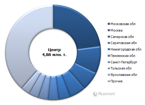 Рис. 3. Структура отгрузки лома черных металлов ЖД транспортом в адрес крупнейших потребителей европейской части РФ