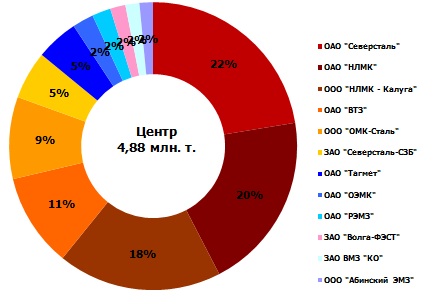 Европейская часть России. Состояние рынка лома черных металлов европейской части России рассмотрим при помощи структуры отгрузки металлолома (Рис. 3). За рассматриваемый период с использованием железнодорожного транспорта в адрес потребителей было доставлено 4,88 млн. т лома черных металлов. В пятерку крупнейших потребителей вошли ОАО «Северсталь» (1,09 млн. т, 22%), ОАО «НЛМК» (0,98 млн. т, 20%), ОАО «НЛМК-Калуга» (0,9 млн. т, 18,4%), а также ОАО «ВТЗ» и ОАО «ОМК Сталь» на которые пришлось соответственно 18% и 11% от общей отгрузки в европейский регион.