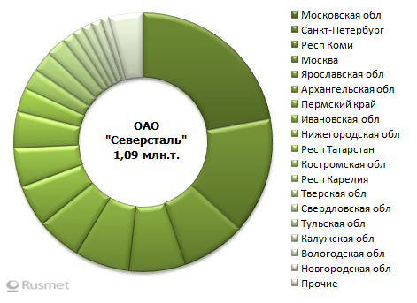 ОАО «Северсталь». За первые восемь месяцев выплавка стали на предприятии увеличилась на 1,33% по сравнению с АППГ до 7,38 млн. т, за этот же период по железной дороге было получено 0,924 млн. т металлолома. По итогам 9 месяцев отгрузка лома на Северсталь ЖД транспортом уменьшилась на 14,6% относительно АППГ до 1,09 млн. т. Структура отгрузки (Рис. 4) показывает, что больше всего металлолома поступило из Московской области и Москвы (суммарно 320 тыс. т), Санкт-Петербурга (159 тыс. т) и Республики Коми (87 тыс. т).