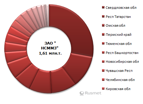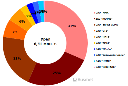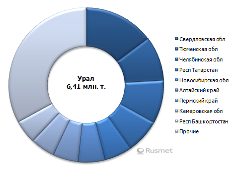 Урал и Сибирь. Традиционно, география закупки лома черных металлов металлургическими предприятиями Урала и Сибири (Рис. 7), охватывает как «домашние области» так и области «коллег-конкурентов» из европейской части страны. Наибольшие закупки отгружаемого по железной дороге металлолома производились ОАО «ММК» в размере 2 млн. т (31% от общего объема в регионе), ЗАО «НСММЗ» (1,6 млн. т, 25 %) и ОАО «Евраз ЗСМК» (1,3 млн. т, 21 %).