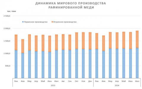 Производство рафинированной меди в июле 2014 г. выросло на 3,3% несмотря на тенденцию снижения потребления