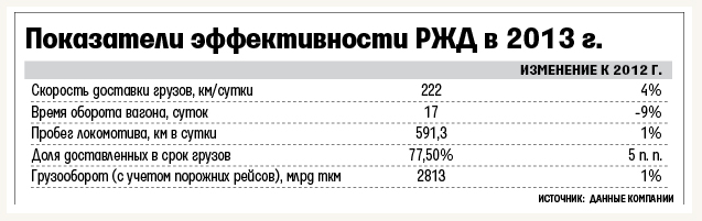 Скорость доставки грузов РЖД в 2013 г. выросла, вырос и грузооборот за счет увеличения порожнего пробега (см. таблицу). А погрузка на сети РЖД в 2013 г. снизилась на 2,8% до 1,23 млрд т.