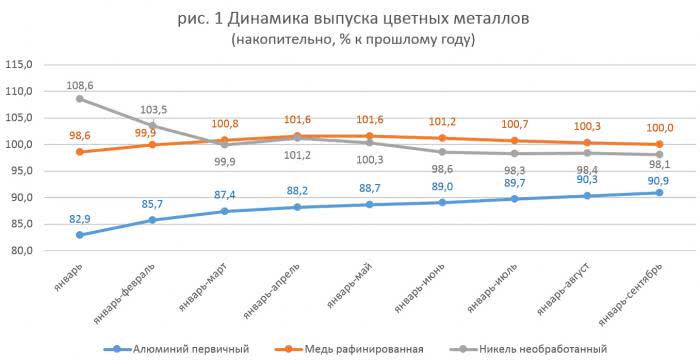 В целом индекс производства в цветной металлургии составил 100,3%, по итогам трех кварталов, что обусловлено ростом производства в секторе драгоценных металлов и продукции высоких переделов.