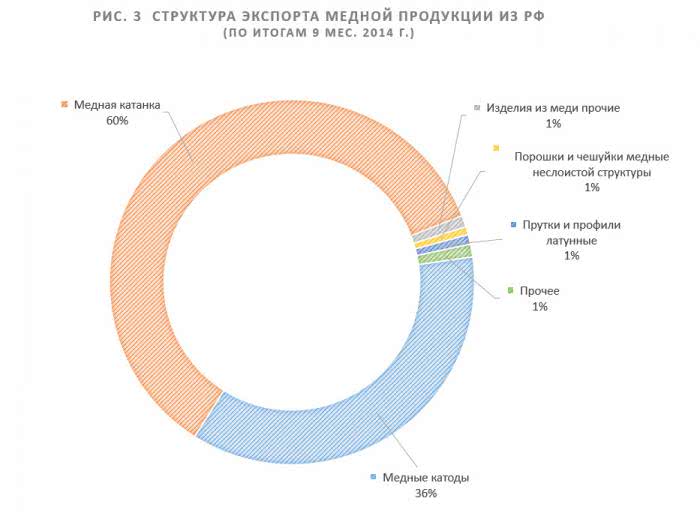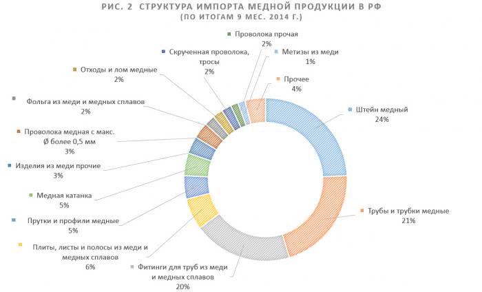 Медная промышленность России снижает обороты вследствие недостатка медных ломов и по причине снижения цен на металл на LME. При этом наблюдается изменение структуры экспорта: в сентябре вырос на 60% экспорт медных катодов, но снизился на 20% экспорт медной катанки. В целом, эти две позиции занимают около 96% российского экспорта меди и медной продукции (рис. 3). В структуре импорта (рис. 2) преобладает продукция более высоких переделов: трубы и трубки, фитинги медные и из медных сплавов. Высокая доля импорта медного штейна обусловлена поставками сырья для дальнейшей переработки одним из отечественных продуцентов.