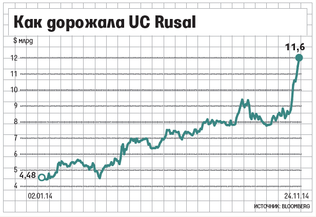 Рост акций UC Rusal может быть обусловлен хорошими результатами III квартала и девяти месяцев 2014 г., поясняет представитель компании. В июле — сентябре UC Rusal впервые с 2012 г. получила позитивный свободный денежный поток ($84 млн) и впервые EBITDA компании ($492 млн) превысила значение III квартала 2011 г. Выручка компании по итогам первых трех кварталов 2014 г. увеличилась на 10,7% до $6,8 млрд.