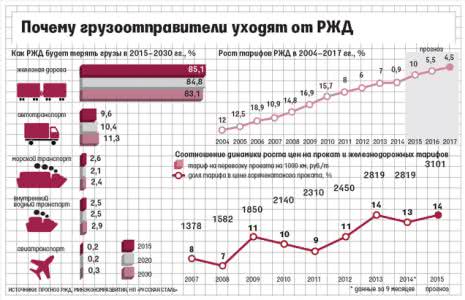 Ранее считалось, что автотранспорт может конкурировать с железной дорогой только на расстояниях до 1000 км. Но постоянный рост тарифов на железнодорожные перевозки (см. график) делает экономически выгодным использование автотранспорта на все более далекие расстояния. «Уже нефтяные грузы с Ярославского НПЗ возятся автомобилями на расстояние до 2000 км! Такого никогда не было!» — восклицает топ-менеджер железнодорожного оператора, говоря о переключении грузов с железной дороги на автотранспорт. По оценке гендиректора агентства «Infoline-аналитика» Михаила Бурмистрова, ежегодно на автотранспорт уходит 2-3% от общего числа перевозимых по железной дороге грузов. Автотранспорт быстрее, удобнее и часто дешевле в сравнении с железной дорогой, объясняют грузоотправители. В 2013 г. погрузка на РЖД составила 1,24 млрд т, и монополия прогнозирует, что к 2030 г. доля грузов, которые перевозятся автотранспортом, увеличится до 11%, а железной дорогой — сократится до 83% (см. график).