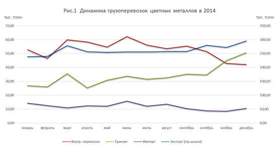 В течение 2014 года происходила переориентация грузоперевозок в сторону повышения доли экспортных и транзитных поставок. В итоге, к декабрю 2014 года наблюдается снижение объемов внутренних перевозок цветных металлов в России и переориентация на внешнюю торговлю с такими странами, как США, Турция и Япония. /Источник ИнфоМонитор, b2b-research.ru/