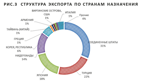 Более 31% экспорта цветных металлов отправляется в Соединенные Штаты, 22% - в Турцию (рис.3). На третьем месте по объему экспорта цветных металлов - Япония (18%), в Нидерланды поставляется 14% от общего объема экспорта.