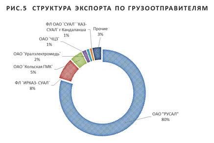 Крупнейшим экспортером (рис.5) в 2014 году стали предприятия «Русала», которые по итогам года осуществили 80% всех экспортных грузоперевозок. ФЛ «Ирказ-Суал» экспортировал 8% от общего объема экспорта за 2014 год, 5% экспортных поставок осуществило ОАО «Кольская ГМК».