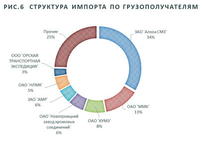 Крупнейшим грузополучателем импортных поставок (рис.6) в 2014 году стало ЗАО «Алкоа СМЗ» (43% от общего объема импорта), на втором месте ОАО «ММК» (13%), на третьем месте ОАО «КУМЗ» (8%).