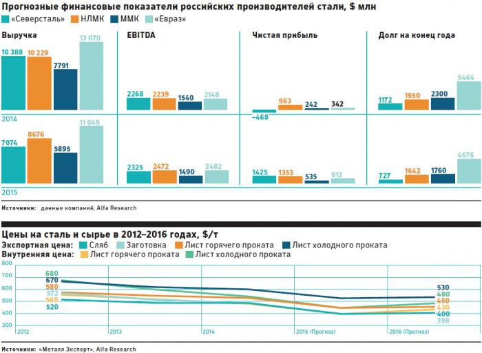 При снижающихся ценах российские металлурги все равно будут уверено держаться на плаву за счет ослабевшего рубля, отмечают аналитики банка. При среднем курсе доллара в 38,6 руб. в 2014 году и 60 руб. в 2015 году металлургические компании, повысив издержки в рублях на 15%, сократят их на 25% в долларах, подсчитывается в отчете. Это положительно скажется на финансовых показателях, особенно у тех, кто больше ориентирован на экспорт. Это – Новолипецкий металлургический комбинат, «Северсталь» и Evraz, говорится в отчете. Магнитогорский металлургический комбинат, который больше ориентирован на внутренний российский рынок, ухудшит показатели, полагают аналитики Альфа-банка.