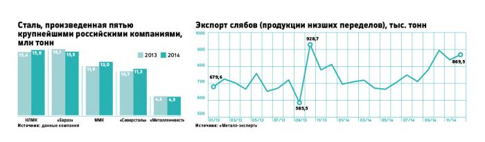 Другие металлурги тоже активно наращивали экспорт. Новолипецкий металлургический комбинат (НЛМК) Владимира Лисина в четвертом квартале 2014 года увеличил поставки за границу на 20%, до 2,3 млн т, доля экспорта составила 59%. Об увеличении объема поставок сообщал и Evraz, крупными акционерами которого являются Роман Абрамович и Александр Абрамов, не раскрывая точных цифр. «Северсталь» Алексея Мордашова в начале прошлого года активно наращивала долю поставок на внутренний рынок, но со второго полугодия зафиксировала соотношение импорта и экспорта.