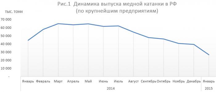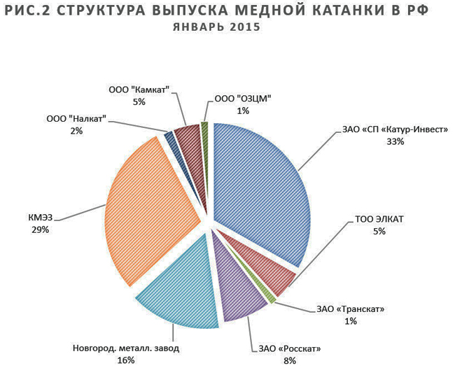 В январе в производстве медной катанки снизилась доля крупнейших предприятий, по итогам первого месяца 2015 года доля крупнейших предприятий составляет 92% рынка. Оставшиеся 8% распределяются между тремя производителям, использующими медьсодержащие лома. Крупнейшим производителем медной катанки в январе 2015 года является ЗАО «СП «Катур-Инвест» (33%), второе место занимает КМЭЗ (29%), на третьем месте ЗАО «НЗМ» (15%).