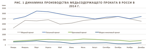Производство латунного проката в марте увеличилось на 20% и достигло максимума месячного объема в 2014 году, но до августа 2014 года наблюдалось снижение производства проката, в сентябре, октябре и декабре зафиксирован рост производства в среднем на 6,5% ежемесячно.