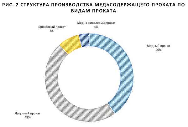 В целом за 2014 года структура российского производства по видам медьсодержащего проката выглядит следующим образом: производство медного проката занимает 40%, производство латунного проката – 48%, на производство бронзового проката приходится 8% от общего объема производства медьсодержащего проката, а на медно-никелевый прокат – 4%.