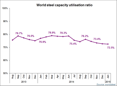 Средняя загрузка производственных мощностей по 65 отчитывающимся в WSA странам в январе 2015 составила 72,5%, что на 4,4 процентных пункта ниже, чем в январе 2014 года, и на 0,4 процентных пункта ниже, чем в декабре 2014 года.