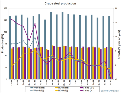 В январе 2015 года выплавка стали в мире сократилась на 2,9% относительно января 2014 года, а загрузка сталеплавильных мощностей - на 4,4%