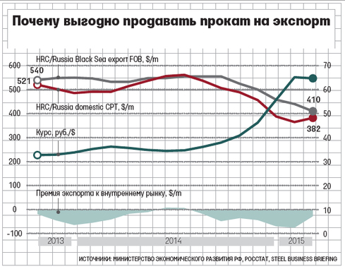 Металлургов поддержала девальвация рубля. Внутренние цены в долларах ниже экспортных (см. график), в рублях они выросли на 25–30%, подсчитал аналитик УК «Альфа-капитал» Андрей Шенк, административная и финансовая поддержка позволит им снизить внутренние рублевые цены при заключении долгосрочных контрактов.
