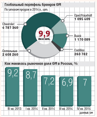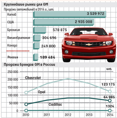 В 2014 г. продажи автомобилей всех марок GM в России упали на 26,4% до 189 484 шт., в январе – феврале 2015 г. – на 74,6% до 8362 шт. Из-за девальвации рубля GM значительно подняла цены на машины. По данным PwC, с сентября 2014 г. по февраль 2015 г. они выросли более чем в 1,5 раза. До этого Chevrolet входил в пятерку самых продаваемых брендов, Opel обычно попадал в десятку. Но по итогам февраля Chevrolet выбыл из десятки, а Opel – из двадцатки, потеряв 74 и 86% продаж соответственно.
