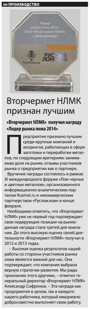 На XI Международном форуме «Лом черных и цветных металлов», организованном Rusmet.ru и РУСЛОМ.КОМ, «Вторчермет НЛМК» получил награду «Лидер рынка лома 2014»