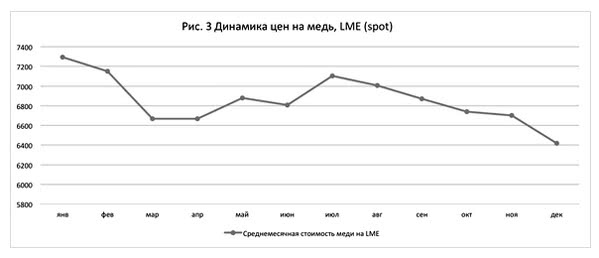 Котировки меди в течение года имели разнонаправленную динамику (рис. 3). В январе зафиксирована максимальная цена меди, далее в первом квартале происходило резкое снижение среднемесячной стоимости меди. В итоге, в марте к январю падение цены меди составило 9%. С марта по май и в июле наблюдался рост цен на медь, однако, во второй половине года стоимость меди стремительно снижалась, и в декабре падение цены к началу года составило уже 12%.