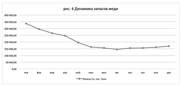 Запасы меди в течение года в среднем снижались на 5,7% ежемесячно. В первом полугодии запасы меди снизились на 13,4%, к концу года наблюдалась положительная динамика запасов, но темпы роста значительно отставали от первого полугодия, в итоге, в среднем по второму полугодию среднемесячный рост запасов составил 0,7% (рис. 3).