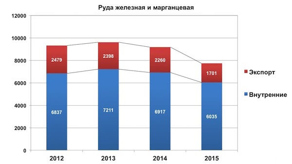 Перевозка железной и марганцевой руды снизилась на 16%: внутренняя - на 13%, экспортная - на четверть.