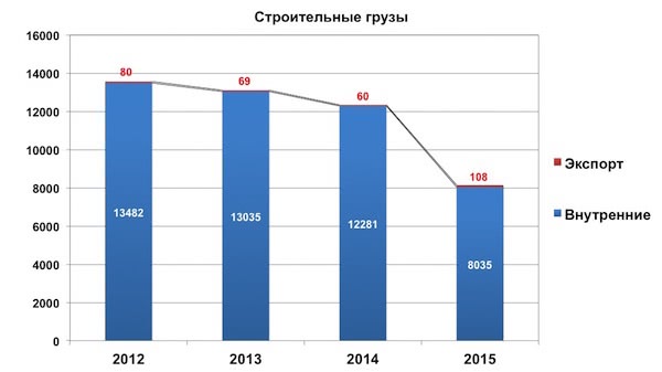 Наиболее драматично, на 34%, сократились перевозки строительных грузов: внутренние - на 35%, зато совсем «символические» экспортные, напротив, возросли на 79%, что, впрочем, почти не повлияло на общую картину.