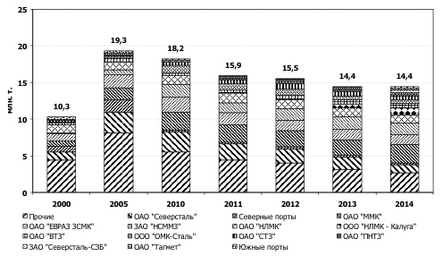Увеличение закупки лома по железной дороги произвело ОАО «НЛМК Калуга», увеличив почти в два раза жд отгрузку в свой адрес до уровня 1 млн. т., также усилило свои позиции Магнитка, прибавив за год в отгрузке 353 тыс. т. и нарастив ее почти до 2,5 млн. т. ОАО «ПНТЗ», после снижения в позапрошлом году на 130 тыс. т. в 2014 г. вновь вернулось на уровень в 470 тыс. т.