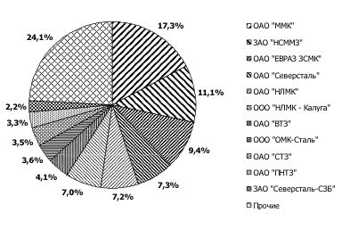 Структура потребителей металлолома в 2014 г. представлена на рисунке 2. Традиционно максимальные покупки производятся металлургическими предприятиями Урала и Сибири – ОАО «ММК» (17,3 %), ЗАО «НСММЗ» (11,1 %), ОАО «ЕВРАЗ ЗСМК» (9,4 %). Замыкают пятерку сталелитейные предприятия центральной части России – ОАО «Северсталь» (7,3 %) и ОАО «НЛМК» (7,2 %).