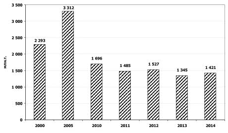 Экспорт. По сравнению с 2013 г. экспорт осуществляемый по сети российских железных дорог увеличился на 5,6 % до 1,421 млн. т., но все равно сохраняет свою тенденцию к уменьшению (см. рис. 3). В экспортном направлении отгрузка производилась из Москвы и Московской обл. направлением в Респ. Беларусь (0,499 млн. т.), из Брянской обл. в том же направлении (0,156 млн. т.), Смоленской обл. (0,108 млн. т.), из Красноярского края направлением Респ. Корею и Китай (0,107 млн. т.) и др.