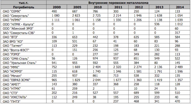 Таблица 1. Отгрузка металлолома в адрес некоторых российских потребителей