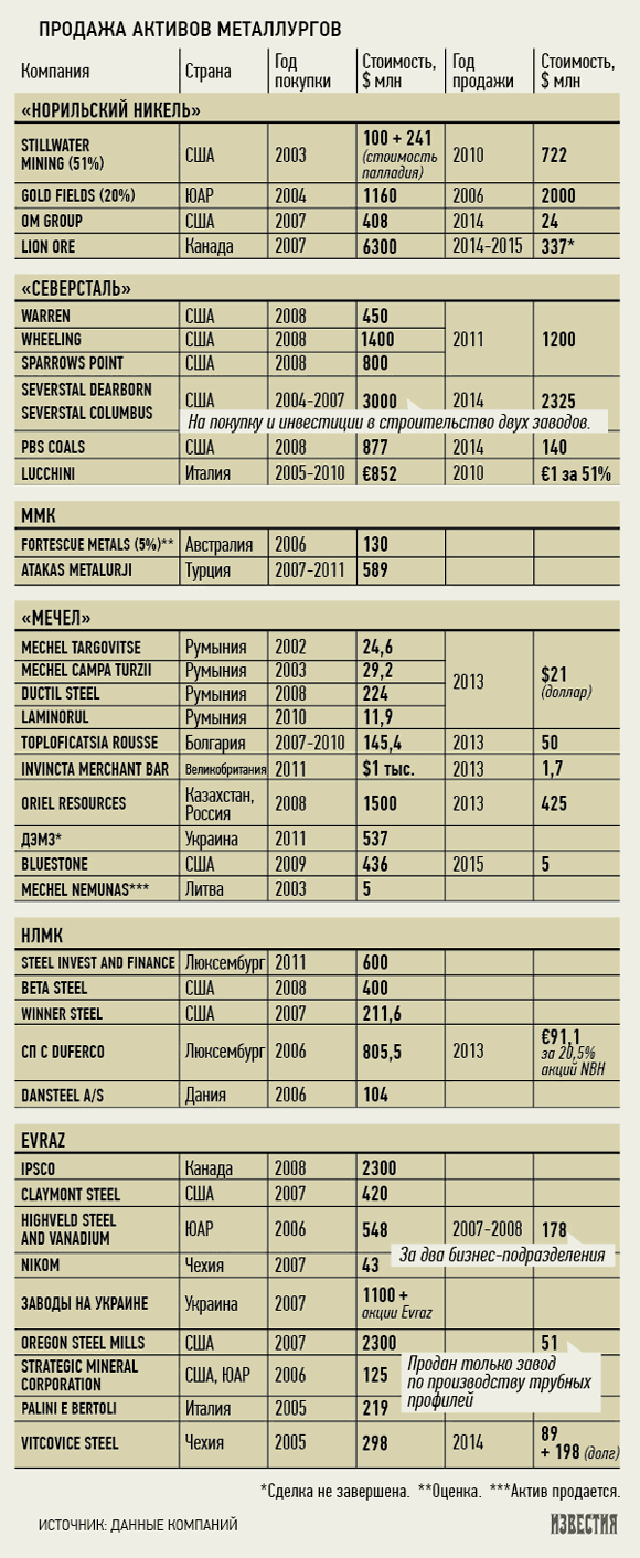 Горно-металлургическая компания «Мечел», так же как и «Северсталь» и «Норильский никель», покупала некоторые зарубежные активы значительно дороже, чем позже продала. Так, в 2008 году «Мечел» приобрел феррохромную компанию Oriel Recources за $1,5 млрд, а продал в 2013 году за $425 млн. В 2009 году «Мечел» приобрел американскую угольную компанию Bluestone за $436 млн, а продал в этом году всего за $5 млн.
