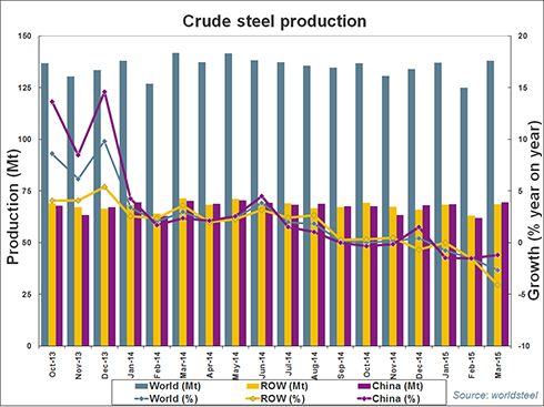 Выплавка стали в Китае в марте 2015 года составила 69,5 млн т, на 1,2% меньше по сравнению с мартом 2014 года. Япония в марте произвела 9,3 млн т сырой стали (-4,5% к марту 2014 года); Южная Корея - 5,7 млн т (-11,8%).