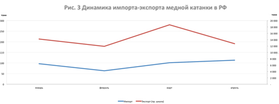 В марте и апреле объем импорта медной катанки увеличивался на 60% и 12% к предыдущему месяцу. Объем экспорта в марте вырос на 57%, но в апреле экспорт снизился на 32%.