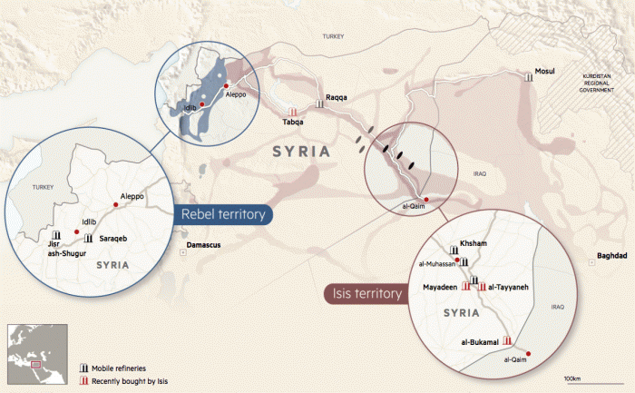 Большая часть нефтеперерабатывающих заводов находится на подконтрольной ИГИЛ территории Сирии. Некоторые НПЗ на контролируемых «сирийскими повстанцами» имеют дурную репутацию из-за более низкого качества продукции, чем заводы на востоке.