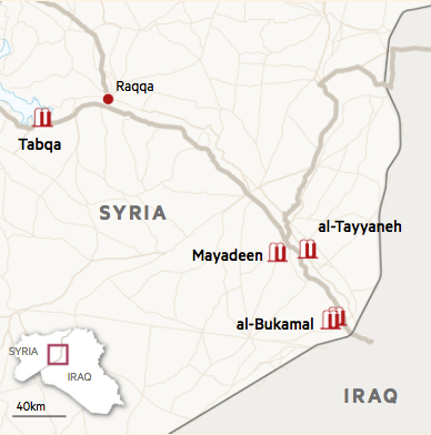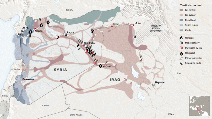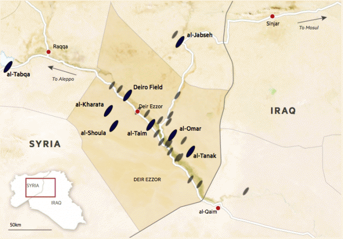 Основной нефтедобывающий регион ИГИЛ находится в восточной провинции Сирии Дейр эз-Зор, где добывается от 34000 до 40000 баррелей в день, по словам местных жителей. Террористическая группировка также контролирует месторождение Кайяра около Мосула на севере Ирака, производящее около 8000 баррелей в день более тяжелой нефти, в основном используемой на месте для изготовления асфальта.