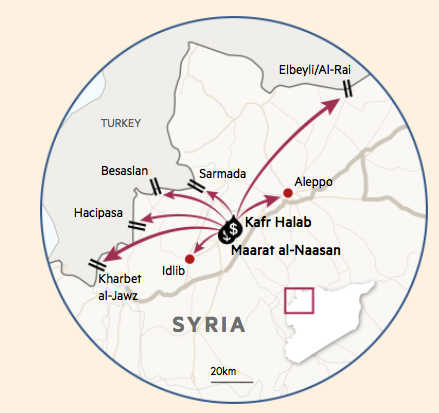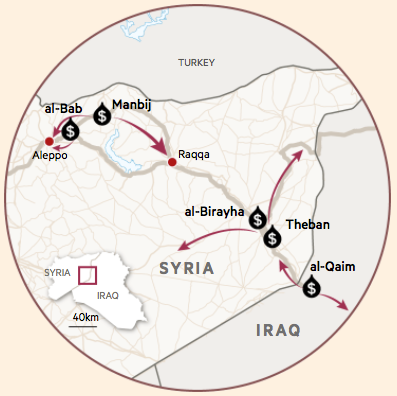 Хотя многие считают, что ИГИЛ в значительной степени зависит от доходов от экспорта нефти, террористы получают прибыль от захваченных ими местных рынков на удерживаемых так называемыми «сирийскими повстанцами» территориях Северной Сирии и в своем самопровозглашенном «халифате», расположенном на границе между Сирией и Ираком (см. карту).