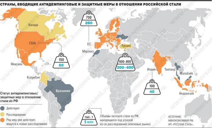 В целом, по оценке НП "Русская сталь", расследования в ЕС, США, Индии, Канаде и Турции ставят под угрозу экспорт 1,5-1,7 млн т проката на $690-790 млн (6% от экспорта за 2014 год по объемам и 4,3% — по деньгам). Все они бьют по производителям плоского проката — НЛМК, "Северстали" и в меньшей степени по ММК, который продает свыше 70% в России.