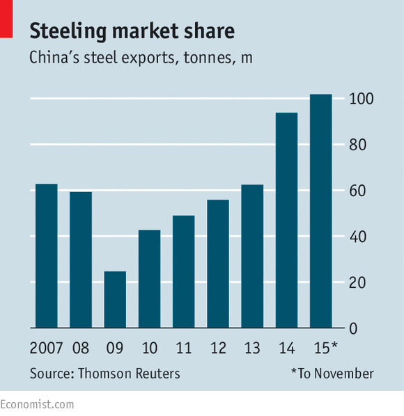 Самый поразительный пример - это сталь. Китай производит около половины годовой мировой выплавки стали, составляющей около 1.6 млрд тонн. Аналитики инвестиционного банка UBS считают, что в этом году КНР произведет на 441 млн тонн больше, чем способен потребить внутри страны. С резким падением цен 101 крупнейшая стальная компания Китая потеряла приблизительно $11 млрд в течение первых 10 месяцев 2015 года или, согласно одной из оценок, примерно двукратную прошлогоднюю прибыль. Неудивительно, что они стремятся экспортировать свою продукцию даже в убыток. Официальные данные, опубликованные на этой неделе, подтверждают, что Китай за 11 месяцев 2015 года впервые в истории экспортировал более 100 млн тонн стали (см. диаграмму). Таким образом, китайский экспорт превышает теперь суммарный объем производства стали любой страной мира, кроме Японии.