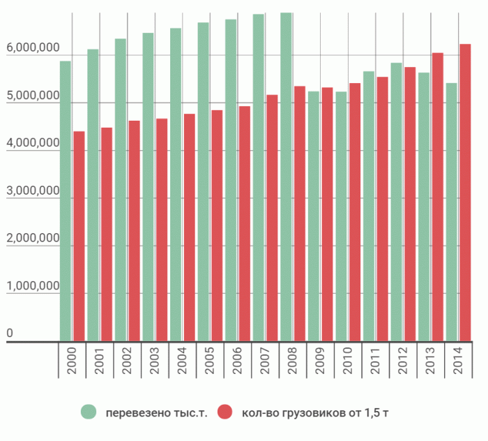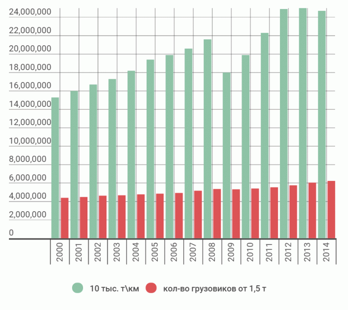 По итогам 2014 года грузооборот автотранспорта составил порядка 247 млрд. тонно*км, объем перевозок — 5,417 млрд. тонн.
