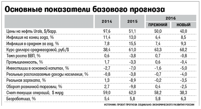 /«Ведомости», 15.01.2016, Александра Прокопенко/ Правительственные чиновники обсуждают обновленную версию социально-экономического прогноза Минэкономразвития (есть у «Ведомостей»): ВВП сократится на 0,8% против ожидавшегося роста на 0,7%; среднегодовой курс рубля составит 68,2 руб./$; цена Urals – $40, инфляция – 8,5%; отток капитала – $50 млрд. Параметры этого прогноза могут лечь в основу поправок в бюджет, знает федеральный чиновник. «У премьера в ближайшие две недели запланирован целый ряд совещаний и встреч с экспертами по социально-экономической ситуации и бюджетной политике», – сообщила «Ведомостям» его пресс-секретарь Наталья Тимакова. Представитель Минэкономразвития лишь напомнил слова министра Алексея Улюкаева: новый прогноз будет в январе.