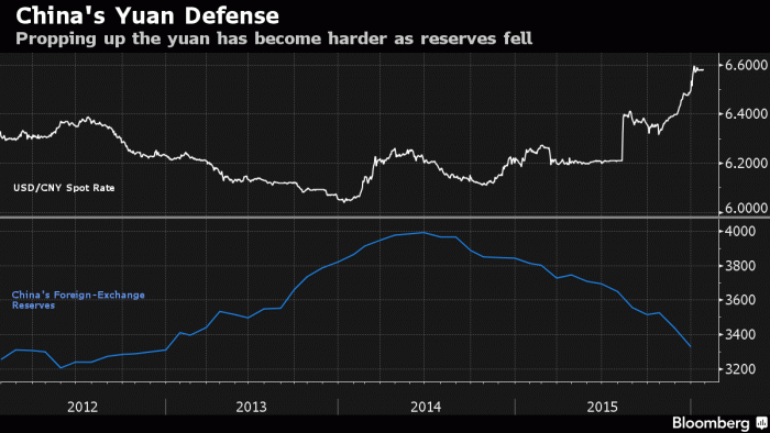 Валютные резервы Китая «похудели» на рекордные $513 миллиардов в прошлом году до $3,33 триллионов, поскольку страна продавала доллар, чтобы поддержать юань. Bloomberg Intelligence считает, что приблизительно $1 триллион капитала покинул страну в 2015 году, подчеркивая масштаб битвы за разгон экономики, растущей сейчас самым медленным темпом с 1990 года.